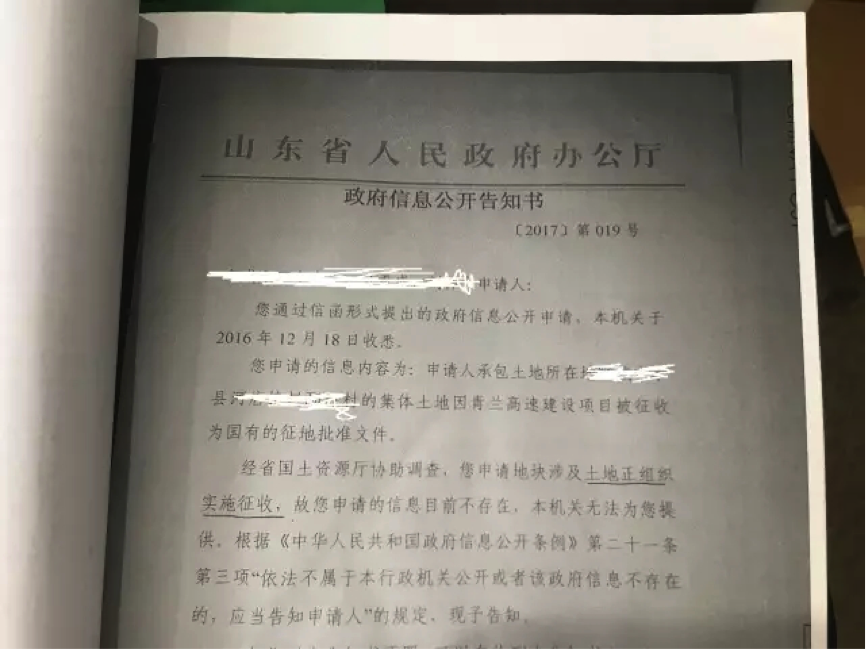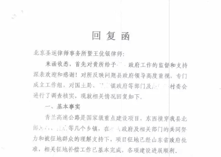 当地政府接到律师函后第一时间和圣运律师取得联系,并对律师函进行了书面回复,回复函声称,本次征地已经由山东省政府予以批准,相关征地补偿工作已基本完成,各项建设进展顺利。