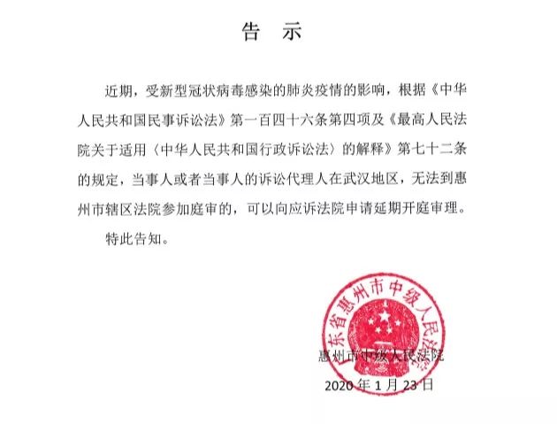 湖北疫情严峻,全国疫情严峻!昨天,广东省惠州市中级法院紧急通知:当事人或代理律师在武汉地区无法参加庭审的,可以延期审理。