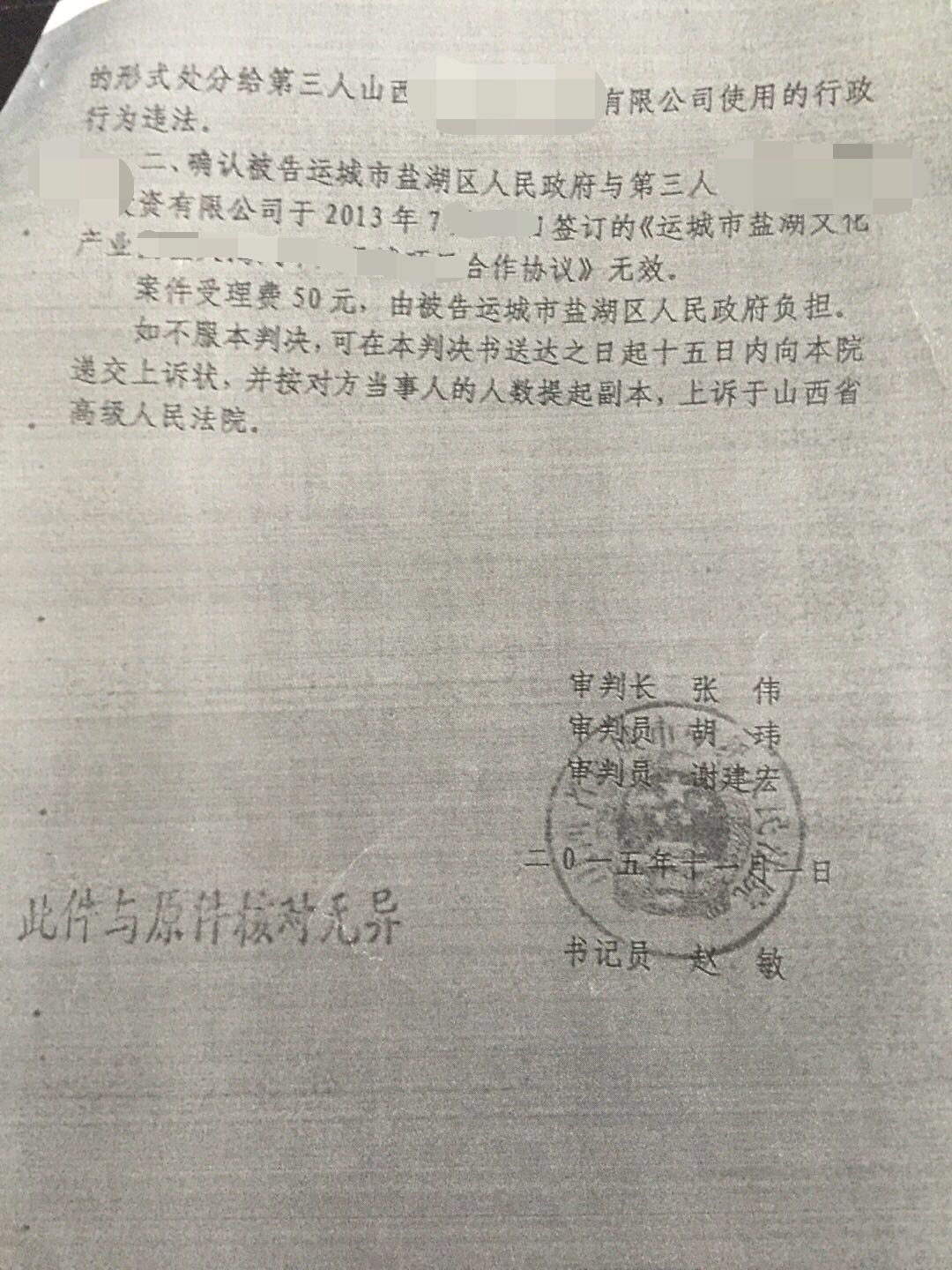最终,法院判决被告运城市盐湖区人民政府与第三人山西某公司签订的《运城市盐湖文化产业园xxx合作协议》无效。