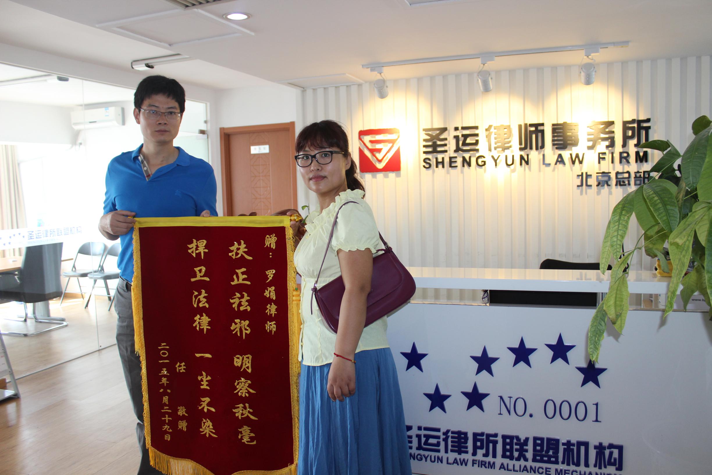 三名当事人对罗娟律师的代理非常满意。2015年9月2日上午,当事人的儿媳妇来到圣运律师事务所北京总部,将当事人特地为罗娟律师制作的锦旗交给圣运律师事务所。圣运律师事务所主任王有银律师代表律师事务所接收了锦旗。