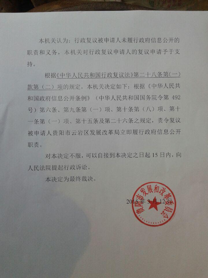 贵州拆迁系列之:行政复议确定政府信息公开不作为违法