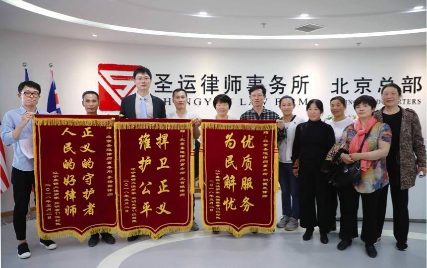 2018年5月4日,辽宁盘锦12户村民在土地案件胜诉后,千里迢迢来到圣运律师事务所北京总部送锦旗,再三感谢王有银主任律师及其团队刘德凤律师和李杨杨助理为他们提供的法律指导,让他们了却一桩心事。