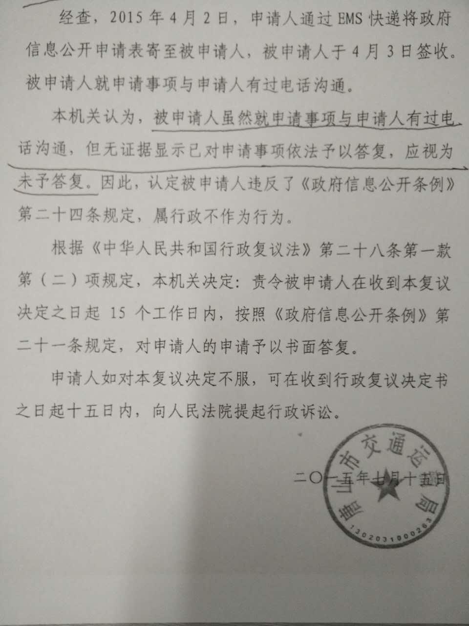 王有银律师和赵凤梅律师认为,本案中唐山市路北区交通运输局未在规定的15个工作日内作出书面答复,不符合《政府信息公开条例的规定》,属于违法行为。于是建议刘先生和曹女士向唐山市交通运输局提起行政复议。最终唐山市交通运输局作出复议决定,确认了唐山市路北区交通运输局未依法向刘先生和曹女士书面公开政府信息的行为违法,并责令该局在收到本判决书后,在法定期限内向刘先生和曹女士作出书面答复并依法公开属于公开的政府信息。刘先生和曹女士等人的合法权益终于得到了维护。