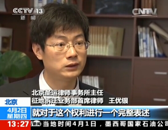 王有银律师简介:北京圣运律师事务所主任,北京理工大学法学院兼职教授、研究生导师,征地拆迁业务部首席大律师,连续四年中国百强律师,十六年法律服务经验,行政法实务专家,北京市律师协会行政法专业委员会副秘书长。因在征地拆迁领域的突出贡献,多次被中央电视台CCTV新闻频道、中央电视台财经频道报道。《中国律师》杂志、《中国律师网》特邀评论员,《第一视频》特邀评论员,参与立法活动,为多个行政立法活动提供建议/意见。荣获2010年度及2011、2013\\2014年度三届中国百强大律师、"2013年度中国十大最具影响力律师"等称号。