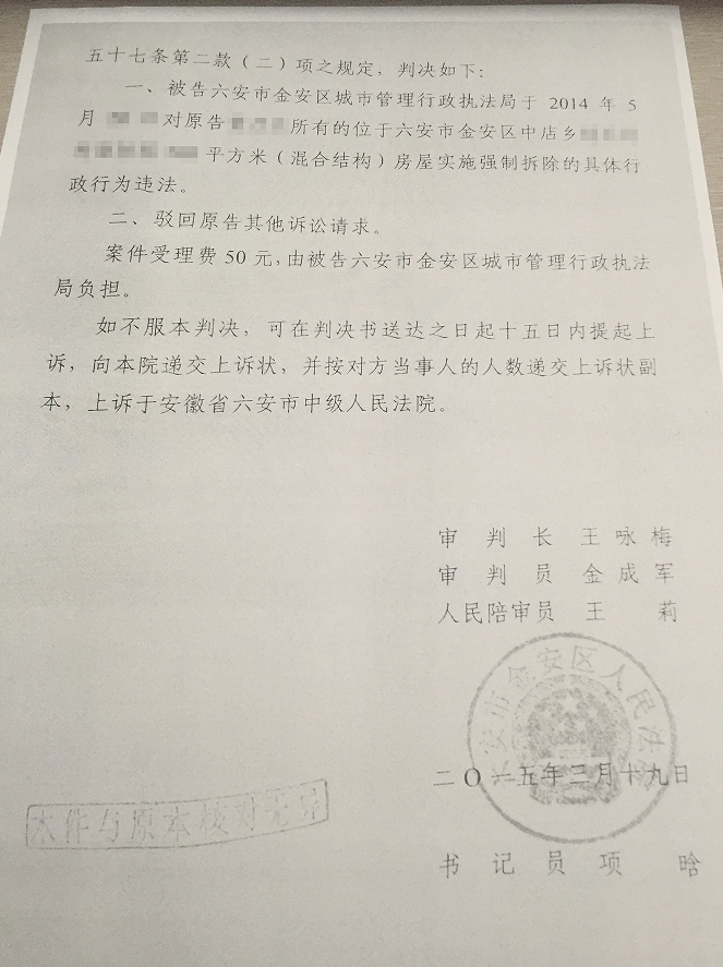 安徽农村拆迁案例:法院依法判决区城管局强拆行为违法