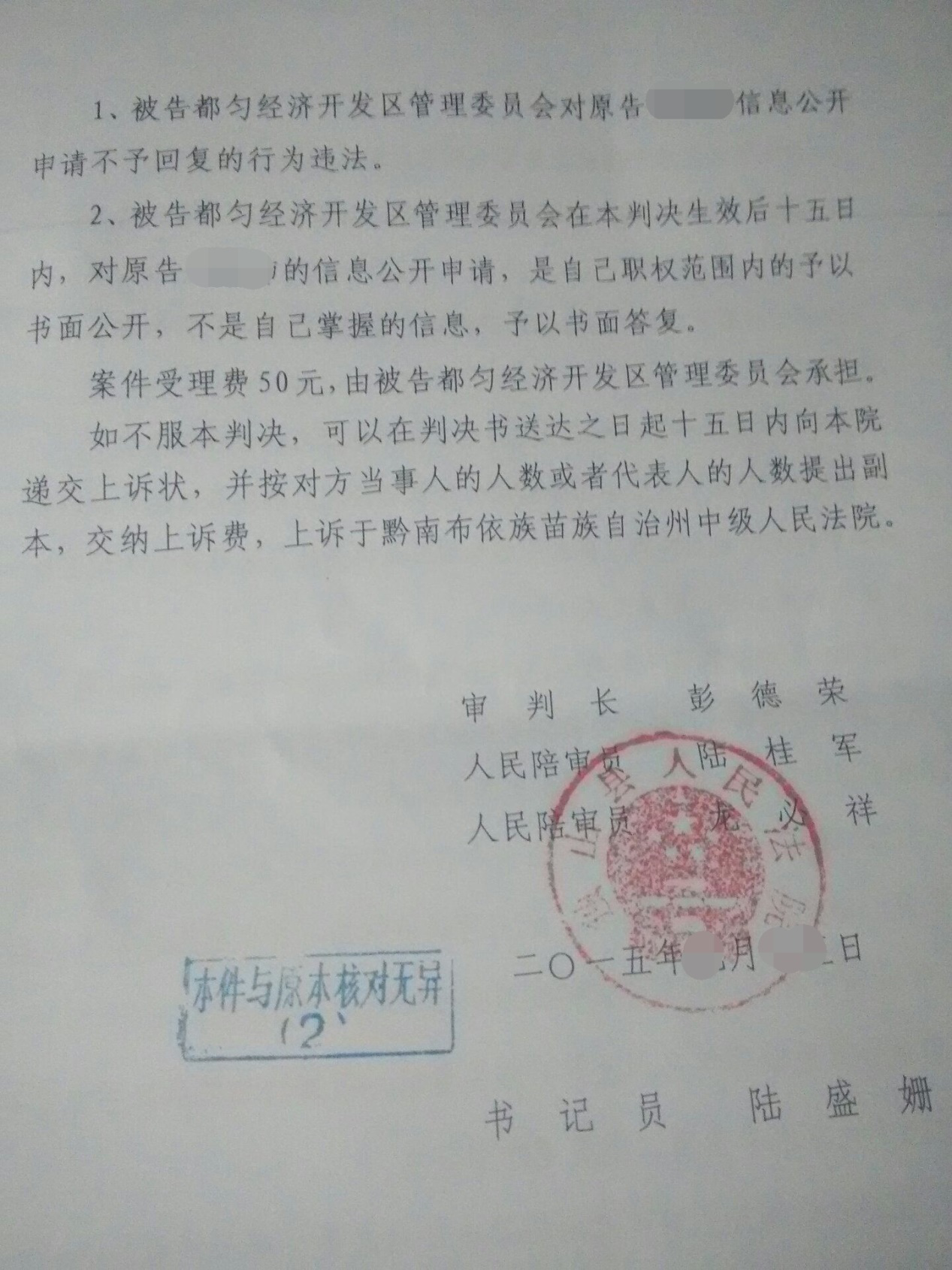 独山县人民法院受理本案后,作出(2015)独行初字第XX号《行政判决书》,责令都匀经济开发区管理委员会于本判决生效之日起15个工作日内履行政府信息公开法定职责。目前该案件还尚未完结,相信