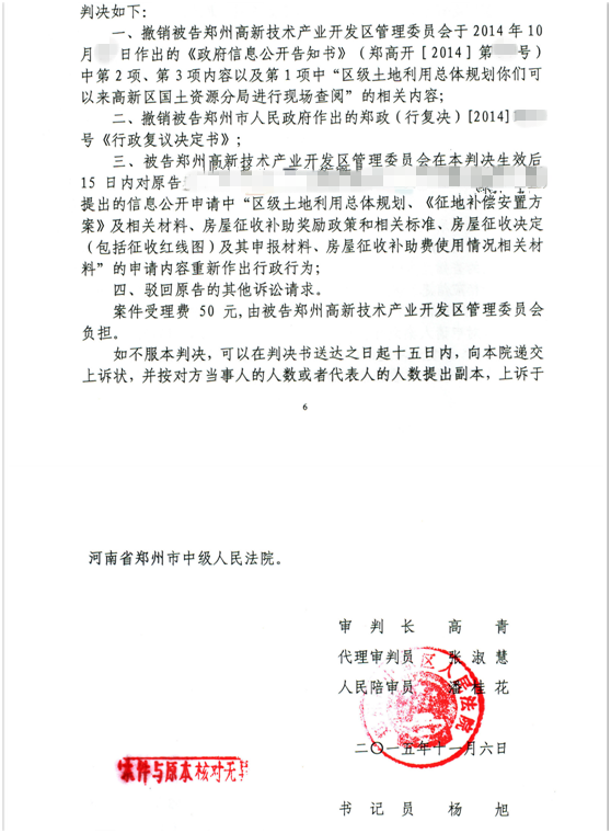 律师和唐琦律师介入案件之后,指导帮助下齐先生六人向郑州市中级人民法院提起诉讼,要求判令高新区管委会履行政府信息公开的职责。郑州市中院指定了区人民法院来审理,并把政府也列为共同被告。