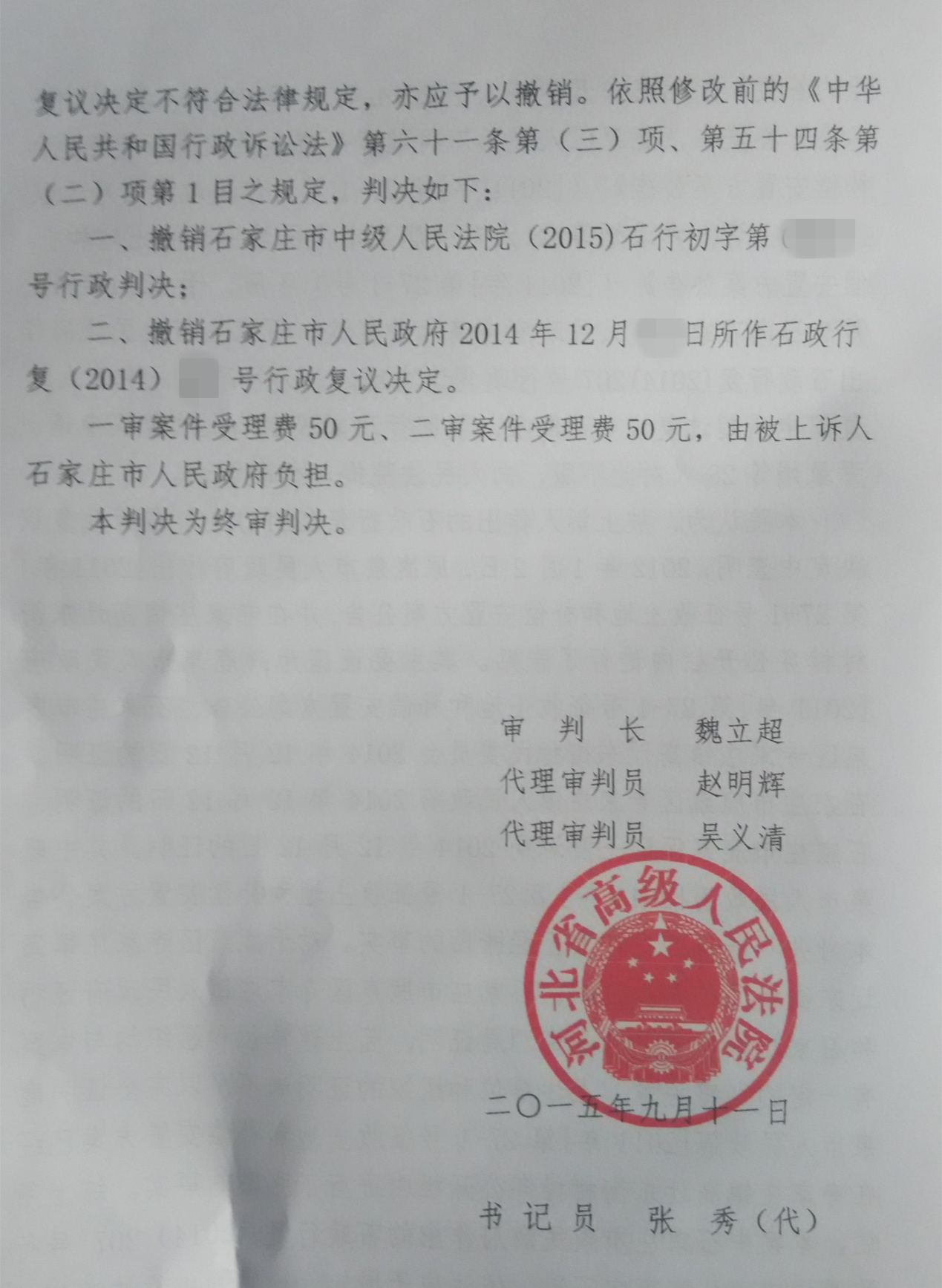 河北农村征地案例:圣运助力28位村民 复议、判决双双撤销