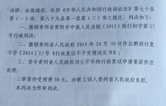 最终,二审法院采纳了律师的意见,撤销了贵州省人民政府的《行政复议不予受理决定书》以及贵州省贵阳市中级人民法院的判决。王女士的合法权益最终得到了维护。