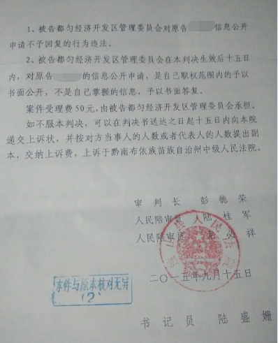 息公开申请表,请求公开该地征收公告、房屋征收决定、房屋征收补偿方案公告等法定文件。此次信息公开的提请,原意在于了解在整个征收拆迁过程中政府是否按照法定程序、方式和途径实施征收行为,未曾想都匀市经济开发区管理委员会从一开始就"心虚",面对韦先生的信息公开申请,他们采取了置之不理视而不见的消极态度,既未作出任何答复,也未告知救济的方式和途径。已经决定用法律武器维权的韦先生决定乘"胜"追击。