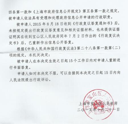 2015年7月2日,张先生申请行政复议,宝山区人民政府对答复书进行审查,最终予以撤销。