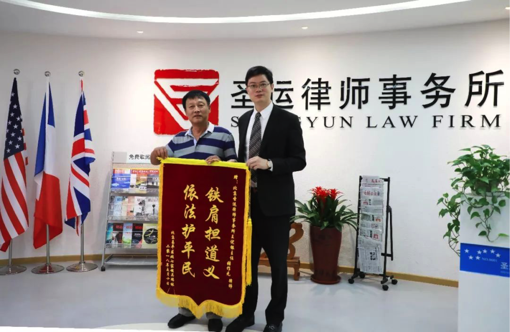 ? 在担任这位当事人郑先生委托律师的过程中,王有银主任及其团队律师借自身扎实的法律功底,丰富的办案经验、突出的专业能力以及严谨的工作态度,在历经行政复议、行政诉讼等一系列的法律程序之后,终使这位当事人的诉求得到了最大的满足。当事人对圣运律师的勤勉付出甚是感激,因而特地赶赴北京圣运律师事务所,当面送上锦旗表示感谢!当事人所有的感激、认可和肯定凝聚成"铁肩担正义,依法护平民"这一句话,也充分印证了圣运律所"承诺只为被拆迁人维权"的宗旨。