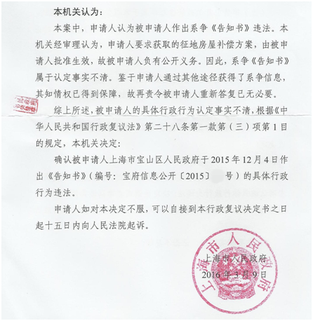 上海市人民政府对案件进行了依法审理,并依据《中华人民共和国行政复议法》第二十八条的规定,作出复议决定:确认被申请人上海市宝山区人民政府对申请人所作出的《告知书》的具体行政行为违法。