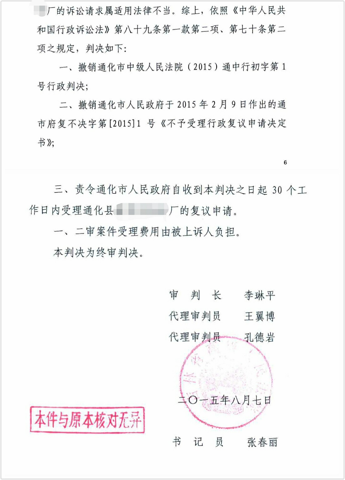 吉林省高级人民法院在对案件进行依法审理后,依据《中华人民共和国行政诉讼法》的相关规定,作出终审判决:1、撤销通化市中级人民法院驳回诉讼请求的行政判决;2、撤销通化市政府作出的《不予受理行政复议申请决定书》;3、责令通化市政府在法定期限内受理上诉人的复议申请。