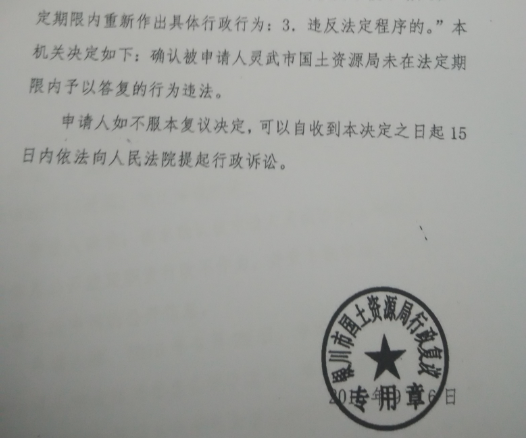银川市国土资源局在对案件进行依法审理后,依据《中华人民共和国行政复议法》的相关规定,作出决定:确认灵武市国土资源局未在法定期限内予以答复的行为违法。