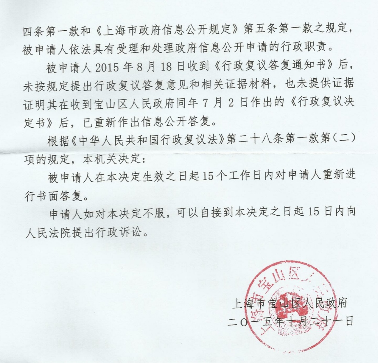 宝山区人民政府受理了复议申请后,对案件进行了依法审理,并依据《中华人民共和国行政复议法》的相关规定,作出决定:被申请人在行政复议决定生效之日起15个工作日内对吴女士重新进行书面答复。