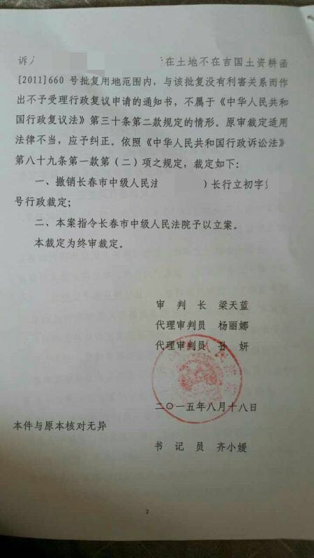 主人团队代理其在此次征收中的法律事宜。北京圣运律师事务所组成案件专项组,对吴先生的案件进行开会研讨,制定的策略之一为对吉林省政府作出的吉国土资耕函[2011]660号批复向吉林省人民政府申请行政复议申请。吉林省政府以吴先生与征地批复没有利害关系为由,作出不予受理行政复议决定。圣运律师遂向长春市中级人民法院提起诉讼,长春市中级人民法院以《中华人民共和国行政复议法》第三十二条为由,认为吉林省政府所作的行政复议决定为终极裁决,故对吴先生的起诉作出不予立案裁定。