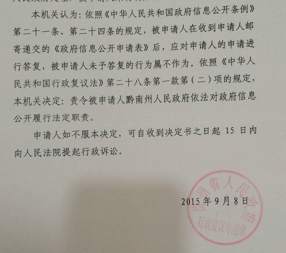 贵州省人民政府对案件进行依法审理后,依据《中华人民共和国政府信息公开条例》以及《中华人民共和国行政复议法》的相关规定,作出如下决定:责令被申请人黔南州人民政府依法对政府信息公开履行法定职责。