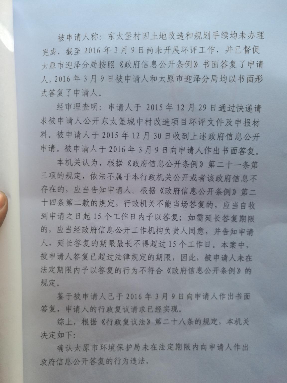 山西省环境保护厅对案件进行依法审理后,依据《政府信息公开条例》以及《中华人民共和国行政复议法》的相关规定作出如下决定:确认被申请人太原市环境保护局未在法定期限内做出答复的行为违法。