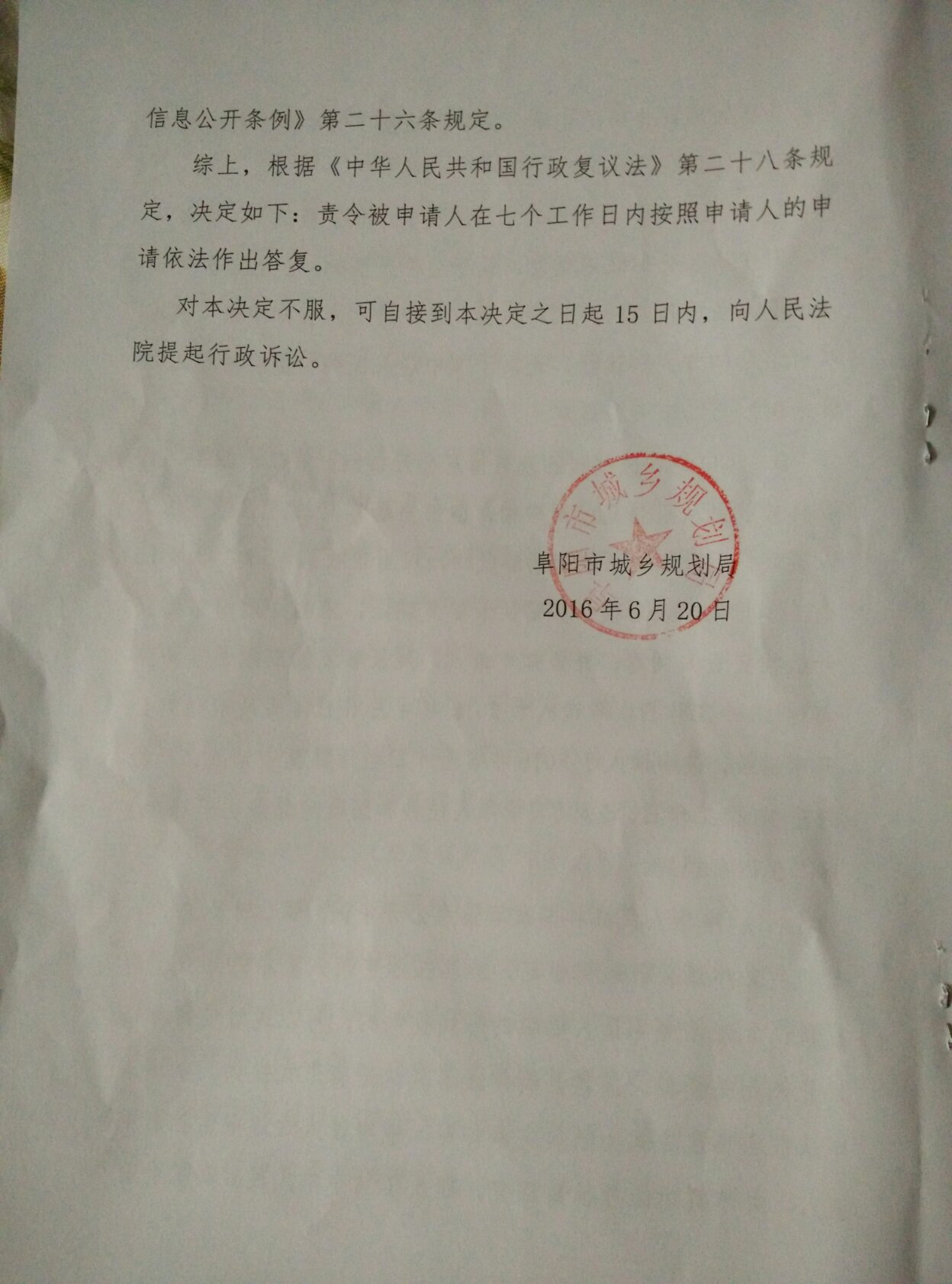 阜阳市城乡规划局受理当事人的行政复议并对案件进行依法审理后,决定:责令临泉县城乡规划局七个工作日内依法作出答复。