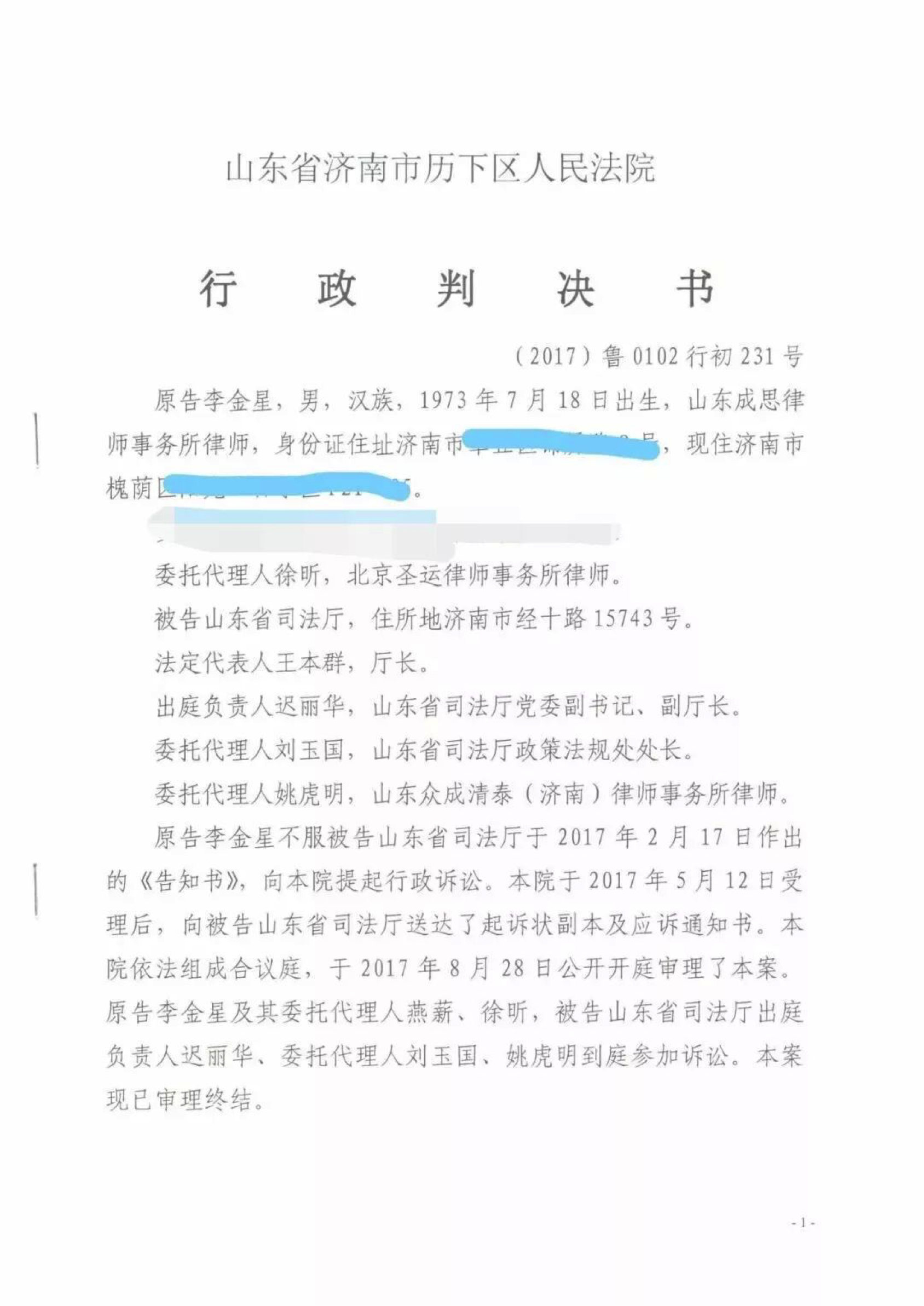 【圣运捷报】圣运律师徐昕代理"李金星律师吊照案" 一审告赢山东司法厅!