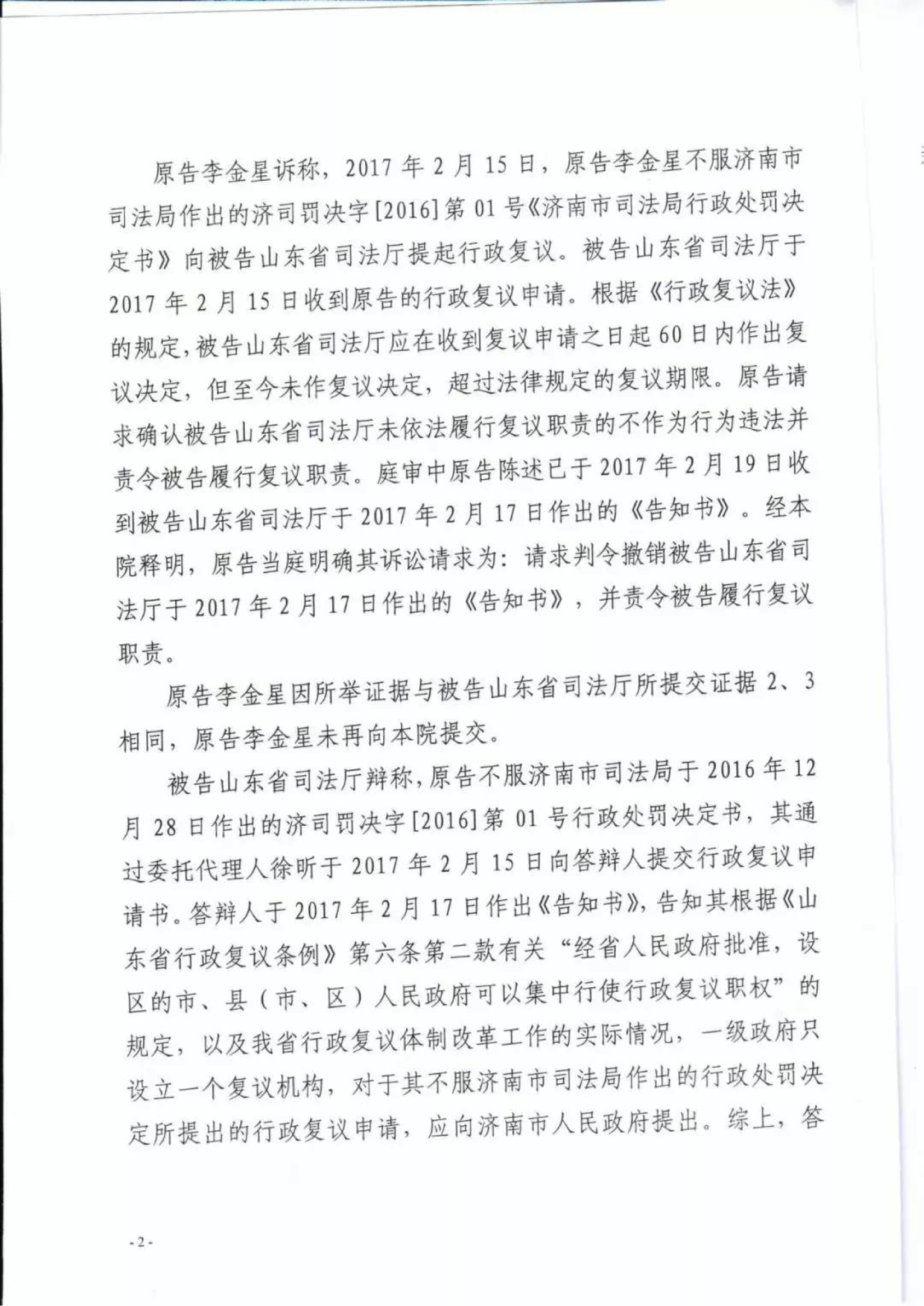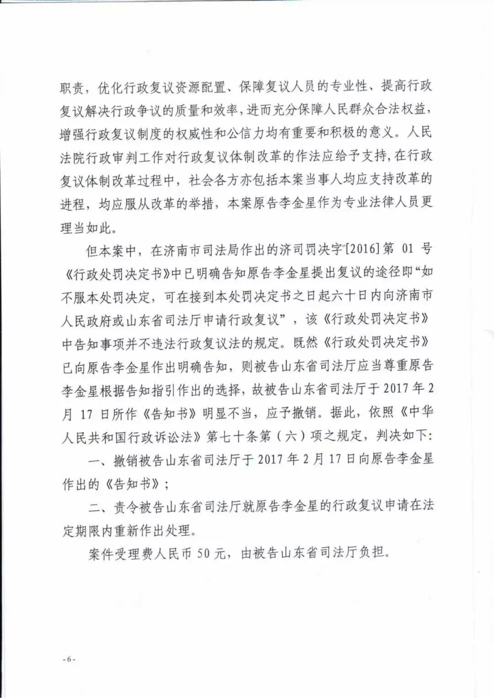 近日,山东省济南历下区法院经审理认为,济南市司法局在其作出的《行政处罚决定书》中已经明确告知了李金星可以选择向济南市政府或者山东省司法厅复议,并且该告知事项符合行政复议法的规定,既然原告李金星选择了向山东省司法厅复议,则被告山东省司法厅应当尊重原告李金星的选择,遂判决撤销了山东省司法厅先前不复议告知书,责令其就李金星的行政复议申请在法定期限内重新作出处理。"虽然迟到了,但我还是满意的。"李金星向财新记者表示,希望该案能督促山东省司法厅重视行政复议,而且司法行政机关要意识到,处罚律师应慎重。