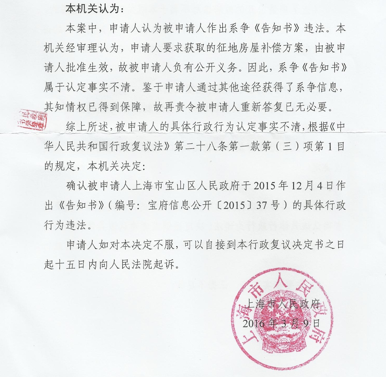 上海市人民政府对案件进行依法审理后,依据《中华人民共和国行政复议法》的相关规定,作出如下决定:确认被申请人上海市宝山区人民政府于2015年12月4日作出《告知书》的具体行政行为违法。