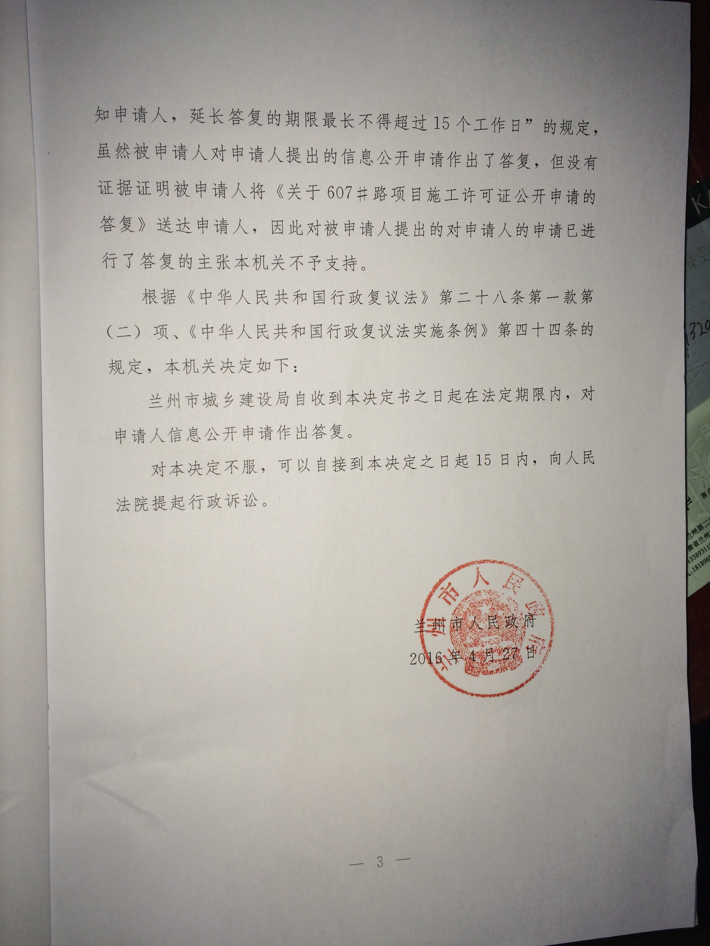 兰州市人民政府受理当事人的行政复议并对案件进行依法审理后,决定:责令被申请人兰州市城乡规划局在法定期限内对申请人申请的政府信息公开依法作出答复。