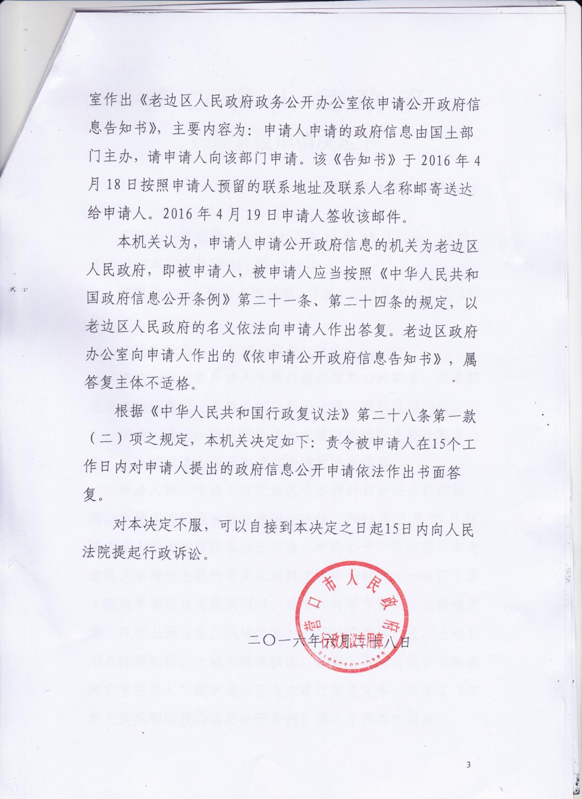 营口市人民政府受理当事人的行政复议并对案件进行依法审理后,决定:责令老边区人民政府法定期限内对申请人申请的政府信息公开作出答复。
