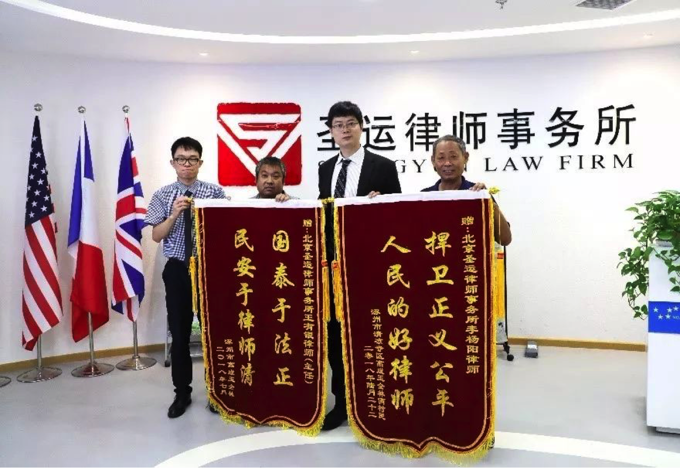 在担任这位当事人委托律师的过程中,王有银主任及其团队律师借自身扎实的法律功底,丰富的办案经验、突出的专业能力以及严谨的工作态度,认真、踏实做好每一个行政复议、行政诉讼的法律程序。当事人对圣运律师的勤勉付出甚是感激,在案件还未完结之际,特地赶赴北京圣运律师事务所,当面送上锦旗表示感谢!当事人所有的感激、认可和肯定凝聚成"捍卫公平正义,人民的好律师"和"国泰于法正,民安于律师清"这两句话。