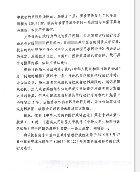 江苏省南京市浦口区人民法院受理当事人的行政诉讼并对案件进行审理后,决定:确认南京市浦口区城市管理行政执法局作出的宁城执浦限字(2015)第1274号限期拆除告知书的行政行为违法。