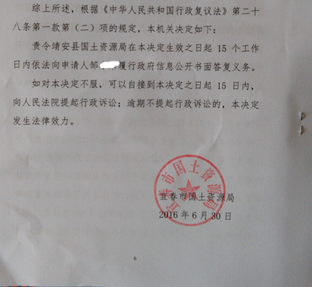 在提起行政复议后,宜春市国土资源局依法受理该申请,尽管靖安县国土资源局举出一系列证据欲证实其行为的合法性,均不被宜春市国土资源局予以认可,最终宜春市国土资源局依法决定:责令靖安县国土资源局在15个工作日内依法向申请人宋先生履行政府信息公开书面答复义务。