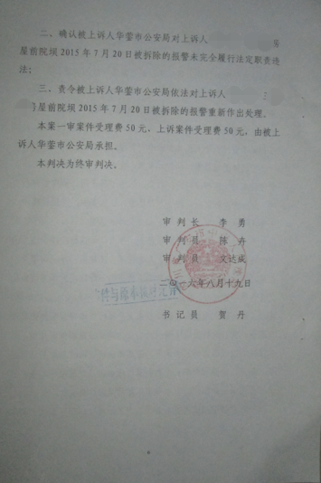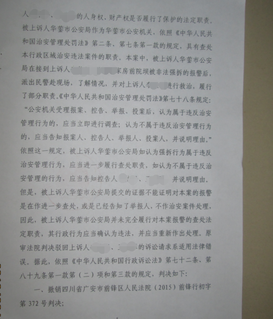 四川省广安市中级人民法院经过法庭审理后,判决如下:一、撤销四川省广安市前锋区人民法院(2015)前锋行初字第372号判决;二、确认被上诉人华蓥市公安局对上诉人李先生、宋女士房前院坝2015年7月20日被拆除的报警未完全履行法定职责违法;三、责令被上诉人华蓥市公安局依法对被上诉人李先生、宋女士房前屋坝2015年7月20日被拆除的报警重新作出处理。