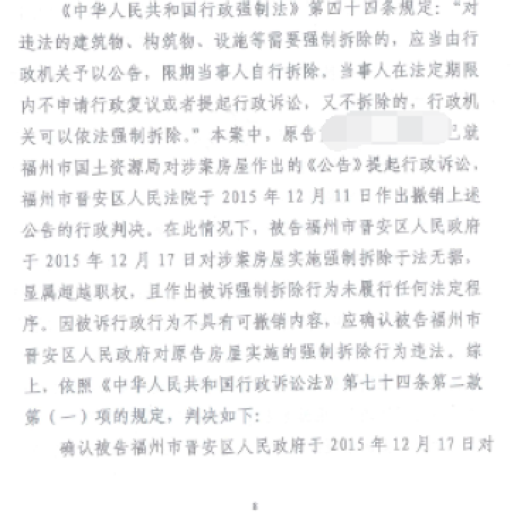 圣运律师事务所介入本案后,由王优银律师团队中的资深律师傅傅增强律师代理该案件。主办律师经过与当事人的交流,再详细了解案情的基础上,迅速制定了最佳的维权方案。针对本案政府强拆行为违法性极强,办案律师决定首先在法定期限内就福州市国土资源局对涉案房屋作出的《公告》向当地法院提起行政诉讼,只有法院撤销掉上述公告,才能为当事人依法维权赢得一个漂亮的开局,同时也更有利于主办律师启动下一步具体维权方案。在诉讼程序启动后,果然如圣运律师的预想的结果一样,福州市晋安区人民法院作出撤销了上述行政判决的公告,在此情况下,被告福州市人民政府作出的强拆行为就是于法无据,显属超越职权范围,且作出被强制拆除行为未履行任何法定程序,被福州市人民法院确认强制拆除行为违法。