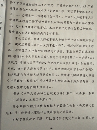 主任及其团队主办律师。为了核实征收行为的合法性,圣运律师帮助张先生向颍州区住房和城乡建设局申请公开建设项目施工许可证等政府信息。而区住建局答复只公开了建设项目施工许可证的办理条件,与张先生申请公开的信息内容严重不符。对于区住建局不履行政府信息公开职责的行为,圣运律师及时代理张先生提起行政复议。复议机关经复议认定,区住建局在申请人对相关信息描述不明确的情形下,不依法告知申请人补正、更改,属于程序违法。最终,责令区住建局重新作出答复。