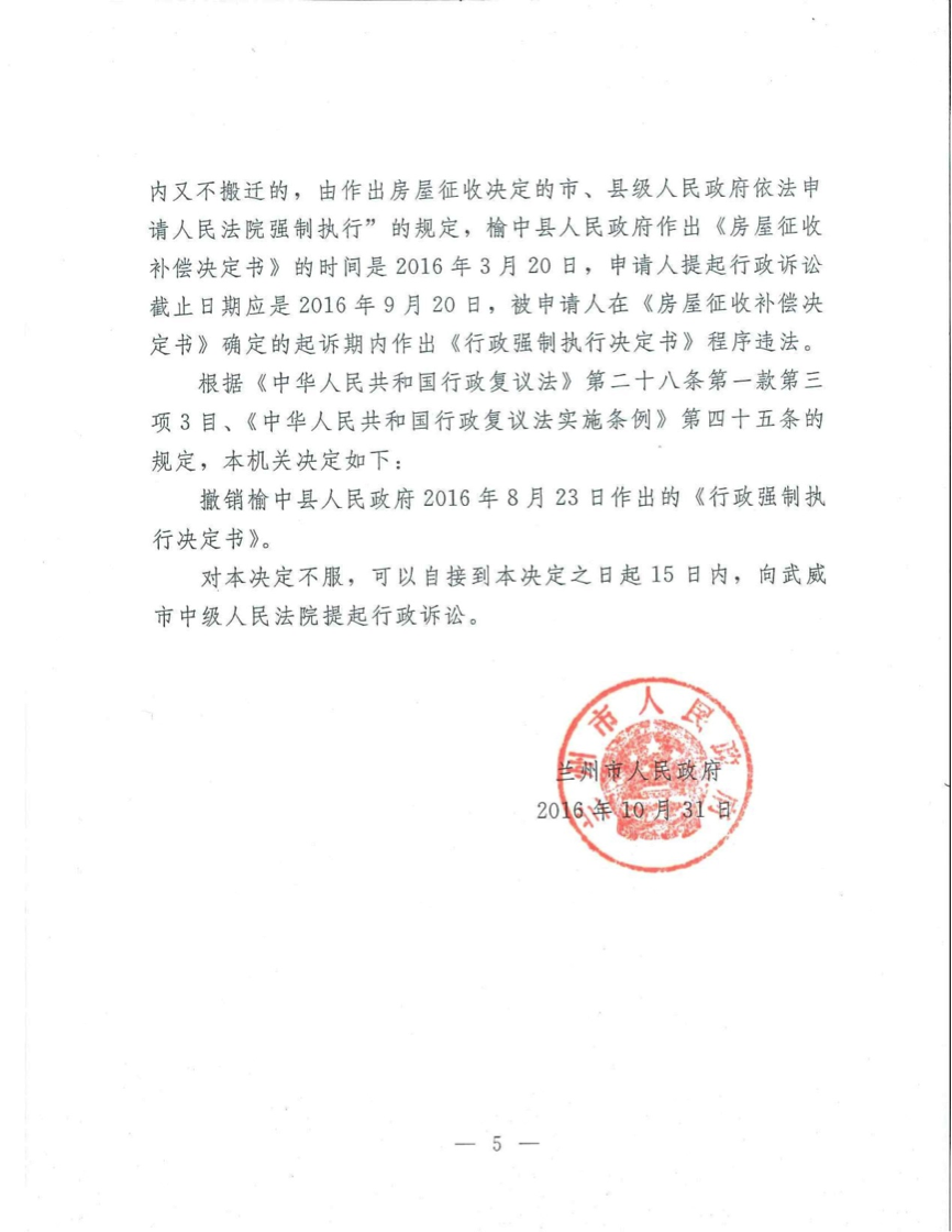 兰州市人民政府受理当事人的行政复议并对案件进行依法审理后,决定:撤销2016年8月23日榆中县人民政府作出的《行政强制执行决定书》。