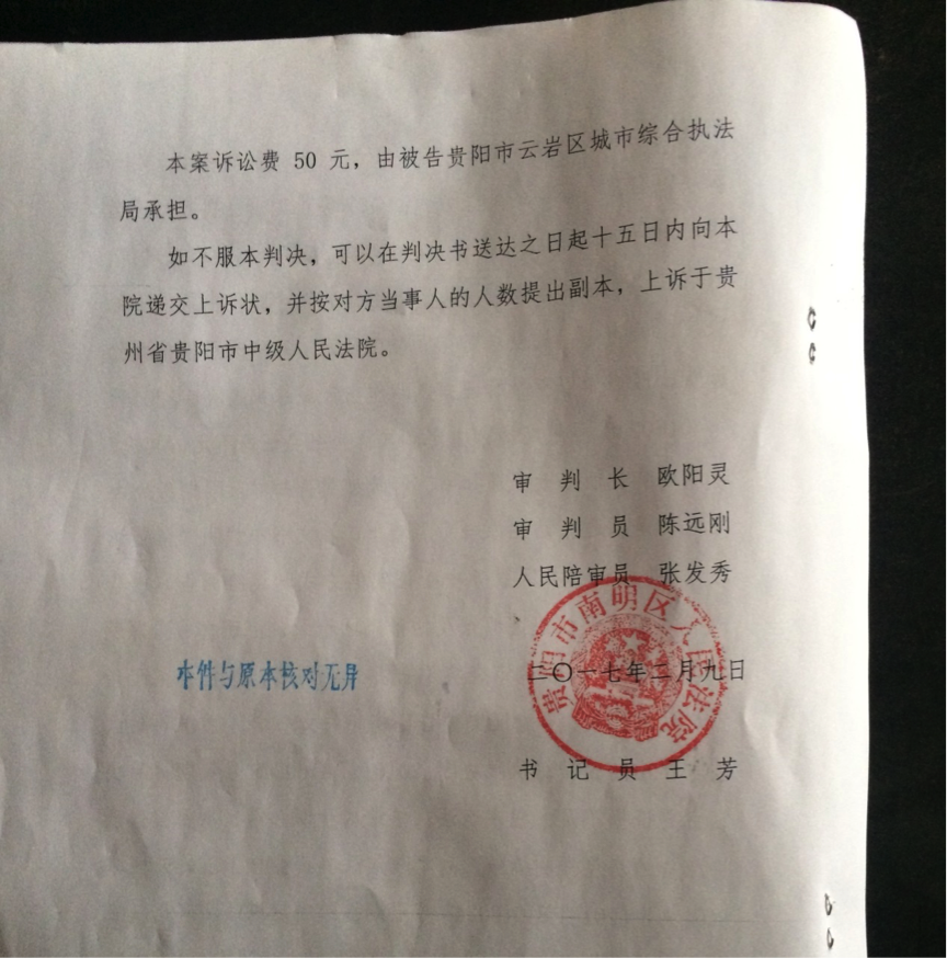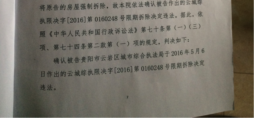 贵阳市南明区人民法院接到起诉状后,经过圣运律师的据理力争,判决如下:一、确认被告贵阳市云岩区城市综合执法局于2016年5月6日作出的云城综执限决字【2016】第0160248号限期拆除决定书违法;二、本案诉讼费50元,由被告贵阳市云岩区城市综合执法局承担。