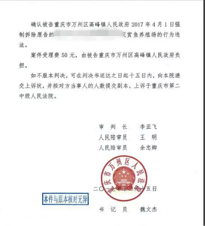 重庆市万州区人民法院在接到起诉书后,经审理,判决如下:确认被告重庆市万州区高峰镇人民政府2017年4月1日强制拆除原告的观赏鱼养殖场的行为违法。案件受理费50元,由被告负担。