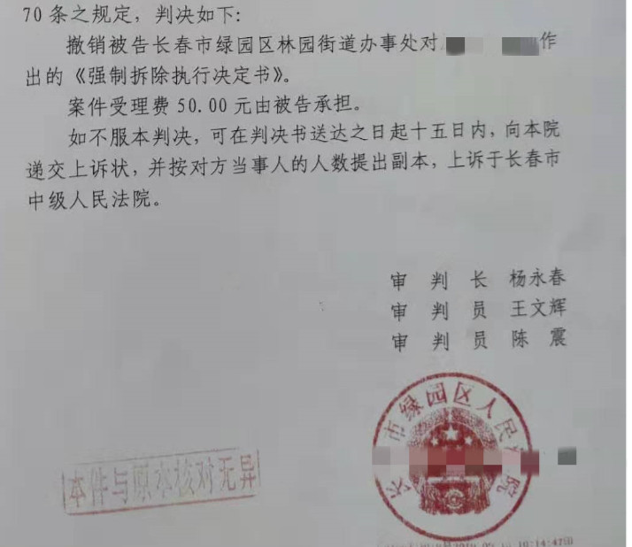 法院经审理后,认可了圣运律师的意见,判决撤销了长春市绿园区林园街道办事处对赵女士作出的《强制拆除执行决定书》。