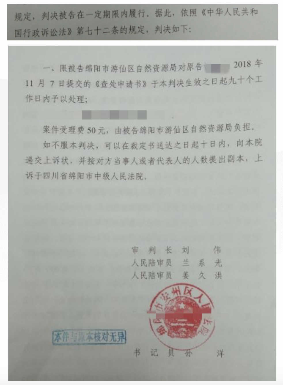法院经审理后,认可了圣运律师的意见,判决限被告绵阳市游仙区自然资源局对肖女士提交的《查处申请书》于判决生效起九十个工作日内予以处理。
