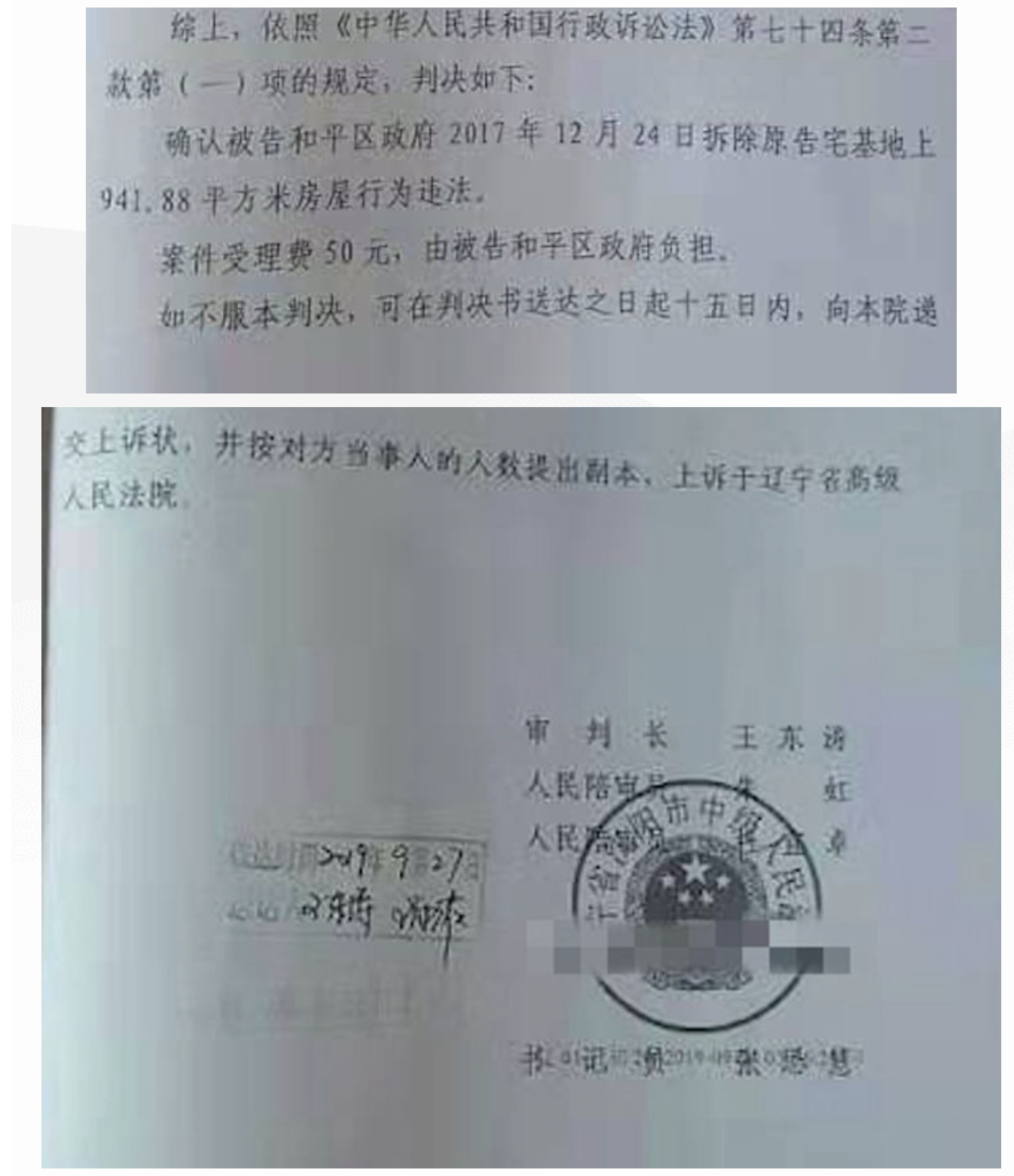 法院经查明案情后,认可了圣运律师的意见,判决确认和平区政府2017年12月24日拆除贺先生宅基地上941.88平方米房屋的行为违法。