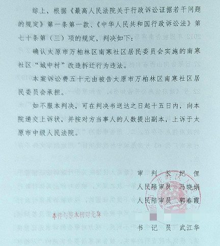 法院经查明案情后,认可了圣运律师的意见,判决确认太原市万柏林区南寒社区居民委员会实施的南寒社区"城中村"改造拆迁行为违法。