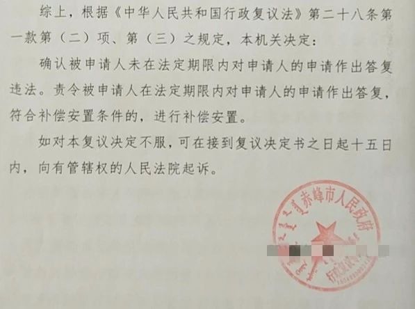 复议机关经审理后,认可了圣运律师的意见,确认红山区人民政府未在法定期限内就林先生的申请作出答复违法。责令红山区人民政府在法定期限内对林先生的申请作出答复,符合补偿安置条件的,进行补偿安置。