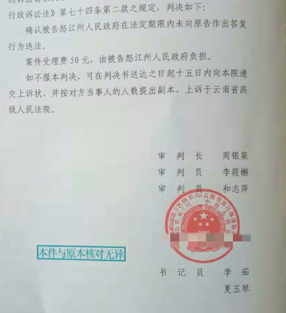 法院经查明案情后,认可了圣运律师的意见,判决确认怒江州人民政府在法定期限内未向原告作出答复行为违法。