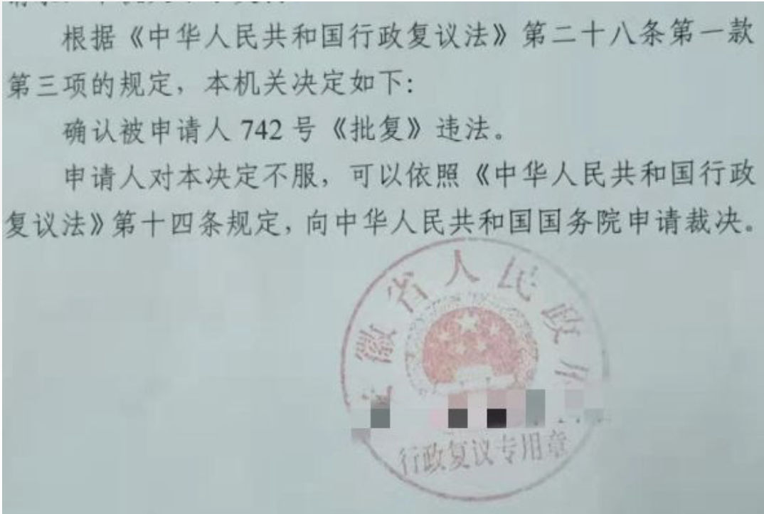 复议机关经审理查明案情事实后,认可了圣运律师的意见,确认安徽省人民政府作出的742号《批复》违法。