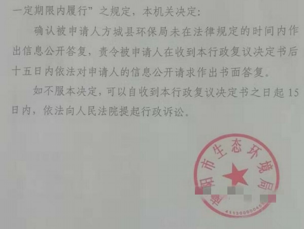 复议机关经查明案情后,认可了圣运律师的意见,确认方城县环境保护局未在法律规定的时间内作出信息公开答复,责令其在收到本行政复议决定书后十五日内依法对孙先生的信息公开请求作出书面答复。