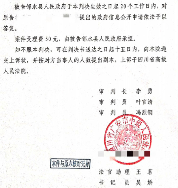 法院经查明案情后,认可了圣运律师的意见,判决邻水县人民政府于判决生效之日起20个工作日内,对龙先生等三人提出的政府信息公开申请依法予以答复。