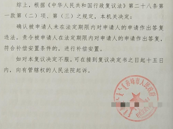 复议机关经审理后,认可了圣运律师的意见,确认红山区人民政府未在法定期限内对季先生的申请作出答复违法。责令红山区人民政府在法定期限内对季先生的申请作出答复,符合补偿安置条件的,进行补偿安置。