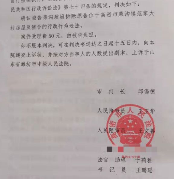 法院经查明案情后,认可了圣运律师的意见,判决确认柴沟政府拆除宋先生猪舍的行政行为违法。