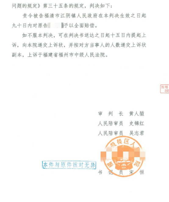 法院经查明案情后,认可了圣运律师的意见,判决责令福清市江阴镇人民政府在判决生效之日起90内对方先生予以全面赔偿。